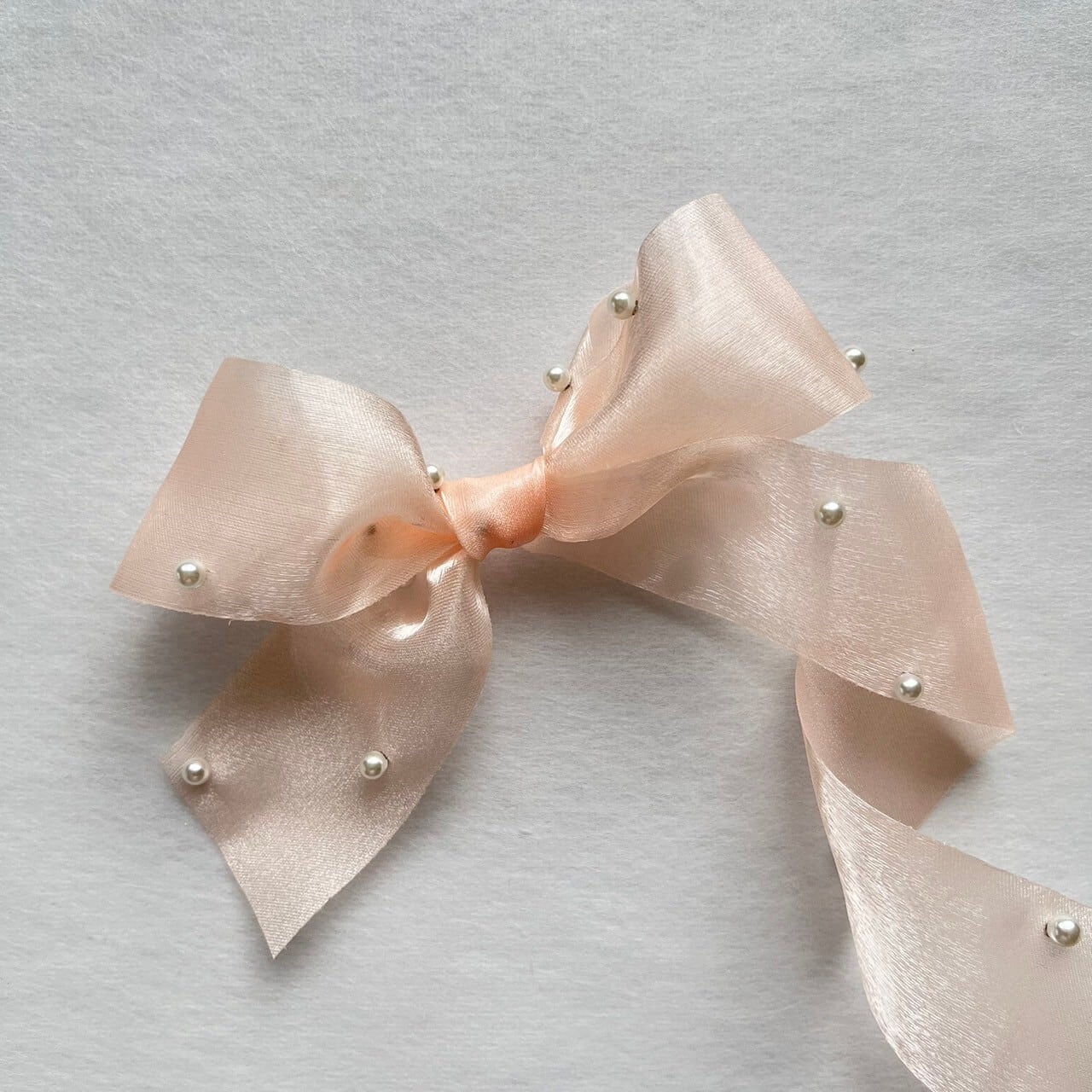 光沢のある薄手のサテン生地にパール粒がリベット付けされているリボンです